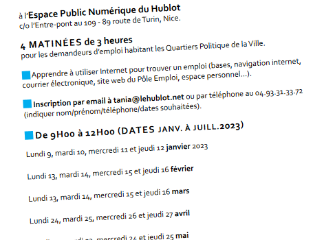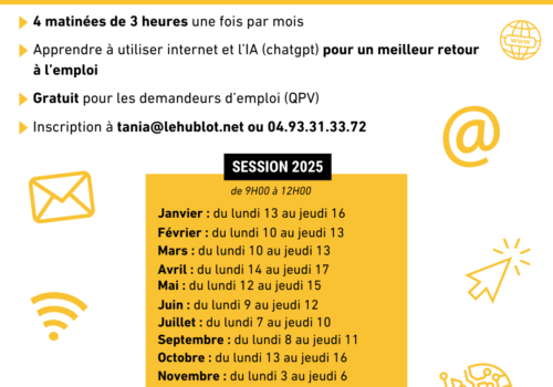 Le Hublot vous propose des ateliers emploi internet, des sessions de 4 matinées de 3 heures une fois par mois,…