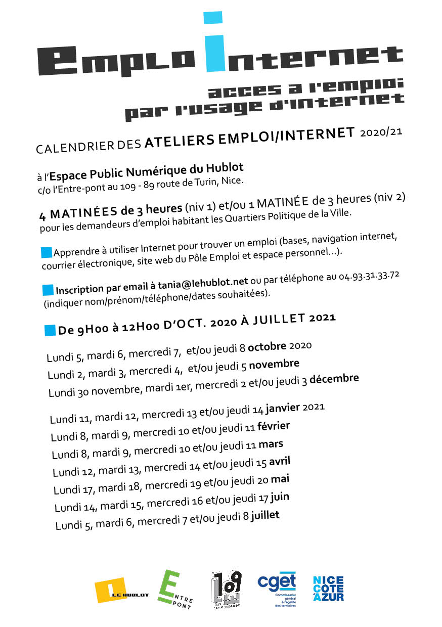 Le Hublot propose des ateliers (4 matinées par mois), pour les demandeurs d’emploi habitant les quartiers de Nice Est afin qu’ils puissent être autonomes sur un ordinateur, sur la navigation sur le web (site du Pôle emploi, recherches d’offres) et sur la communication par email (candidature en ligne).