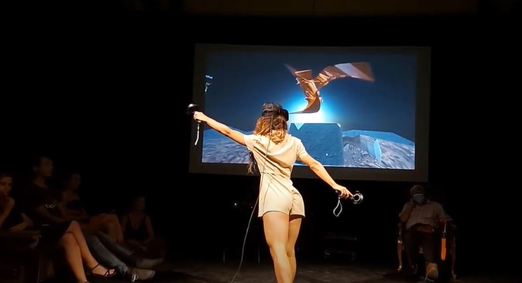 Puis, lors de la performance de la compagnie /TranS/ appelé « la perspective du vide », la danseuse Angélique Pacchiotti, au centre du plateau, est équipée d’un casque de réalité virtuelle ; L’image que l’on voit, présentée sur les deux grands écrans autour du public, est un avatar-oiseau qui la représente. Quand elle bouge dans l’espace, la créature esthétique qui la représente mime ses gestes. Cette représentation dégage une grande esthétique dans le mouvement dans l’univers virtuel. Cette proposition dont la chorégraphe Laurence Marthouret, directrice aussi de la compagnie, rassemble aussi Frédéric Alemany pour l’aspect numérique, Dikaar pour l’environnement sonore.