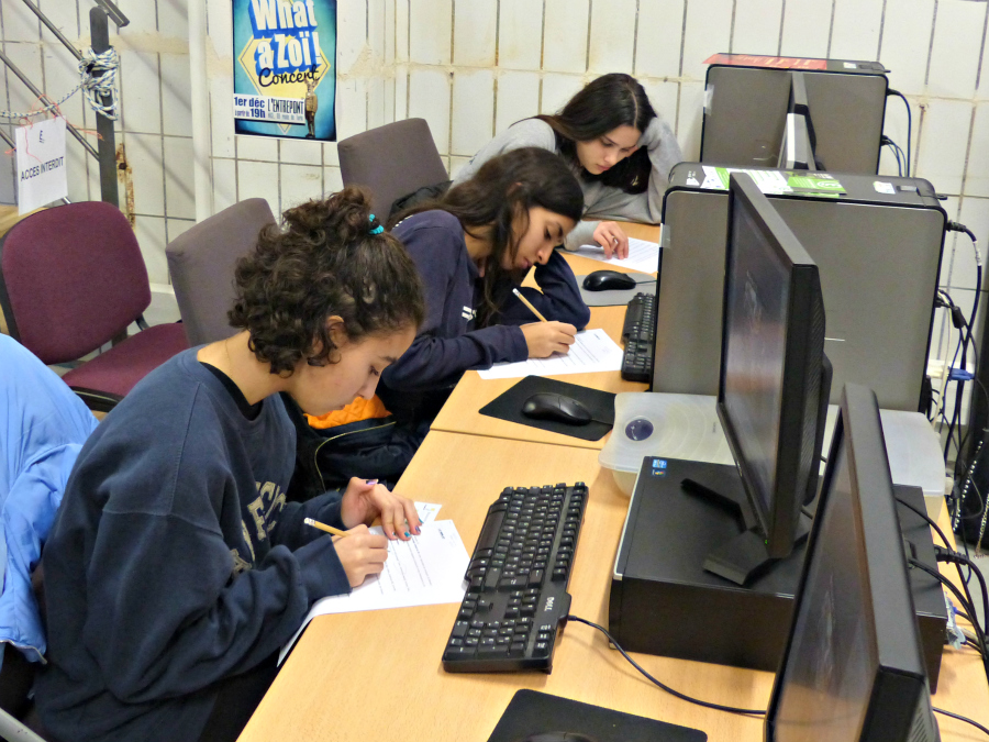 – Accueil des élèves dans la salle informatique du Hublot par Frédéric Alemany (à gauche) et Jerill Quere (à droite).