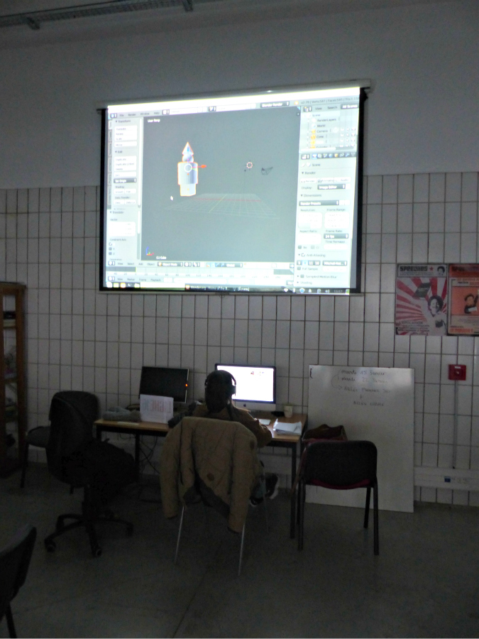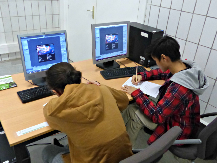 Le groupe d’élèves de l’atelier numérique accompagne ensuite Jerill Quere à la salle informatique. Ce dernier leur présente le logiciel Blender et s’assure de leur prise en main.