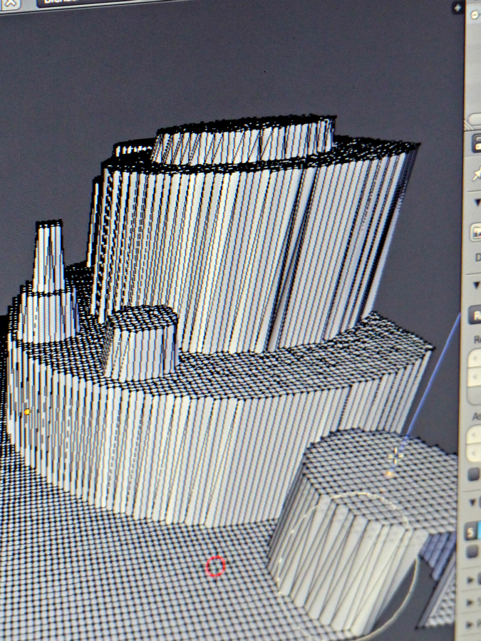Frédéric Alémany nous présente les volumes produits d’après les paysages numériques réalisés la semaine précédente par les élèves, en atelier informatique. Ces volumes en polystyrène ont été sculptés par une fraiseuse numérique CNC.