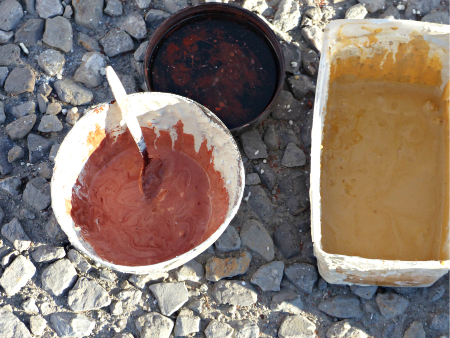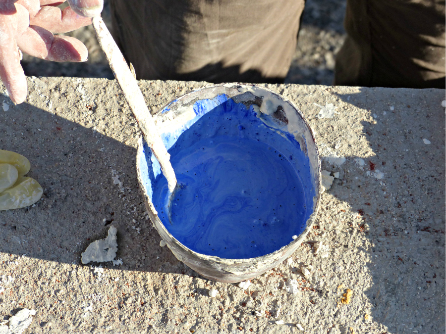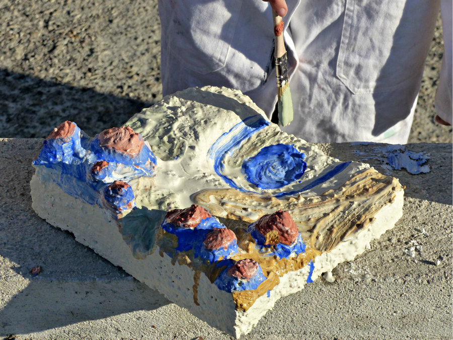 Frédéric Alémany met ensuite à leur disposition les différents pigments de couleur qui vont être utilisés pour se fixer sur le ciment. Les élèves sont appelés à diluer ces pigments puis à peindre leur volume par bandes horizontales successives, afin de respecter les strates colorées de leur paysage numérique référent.