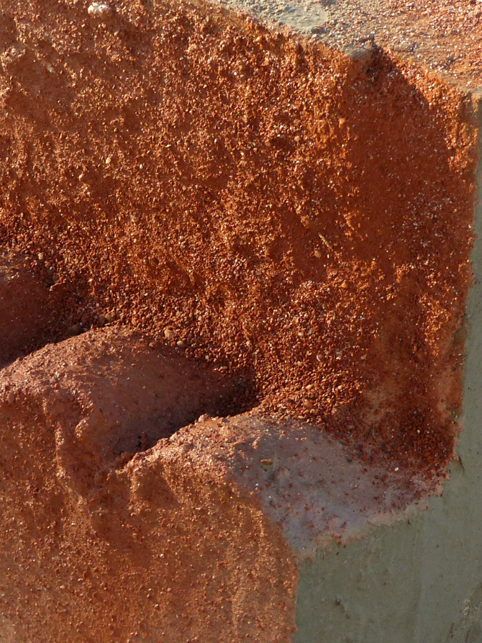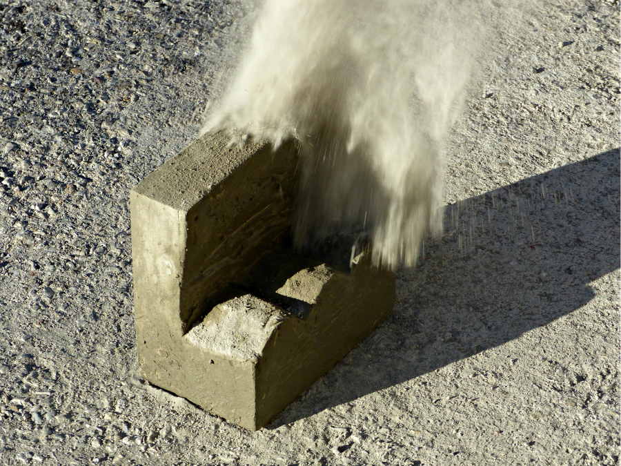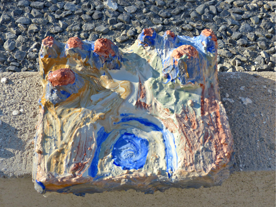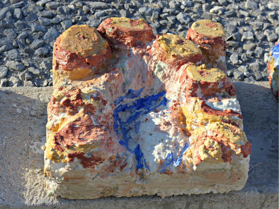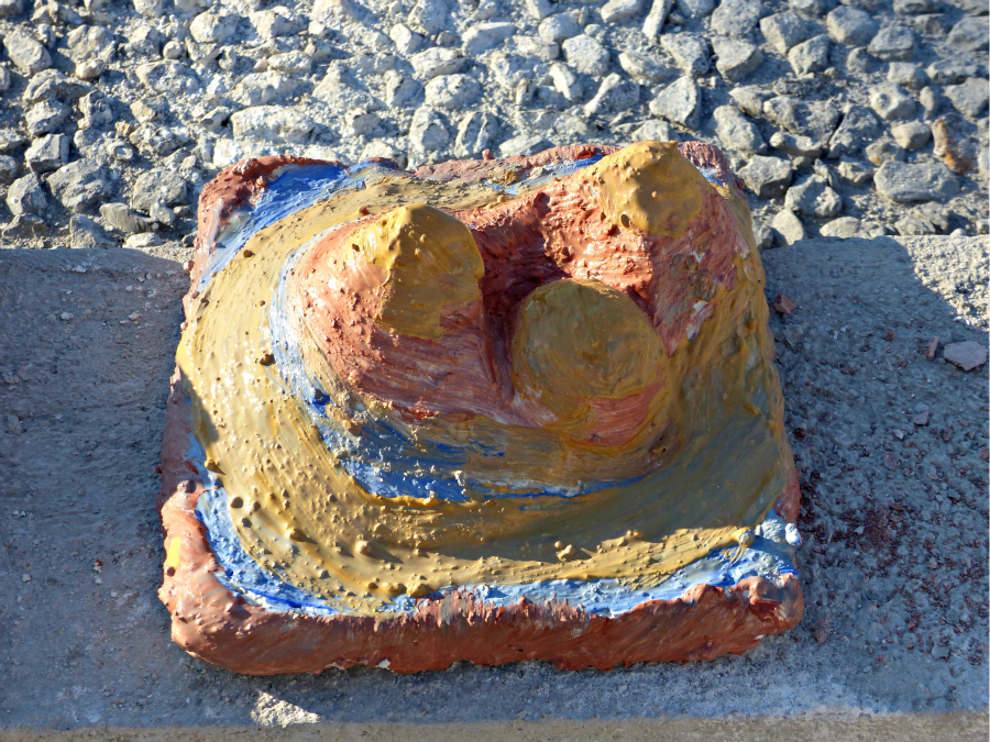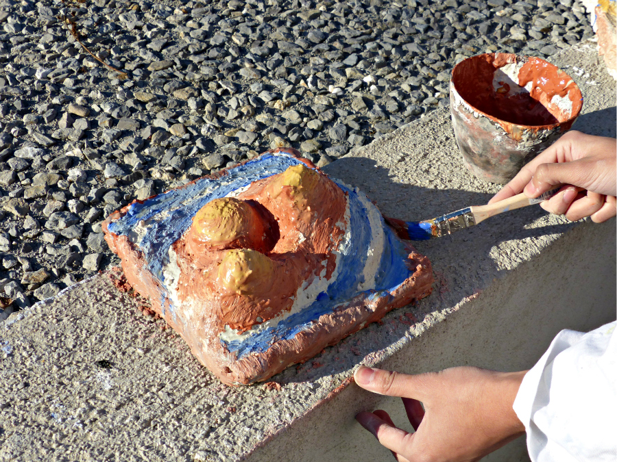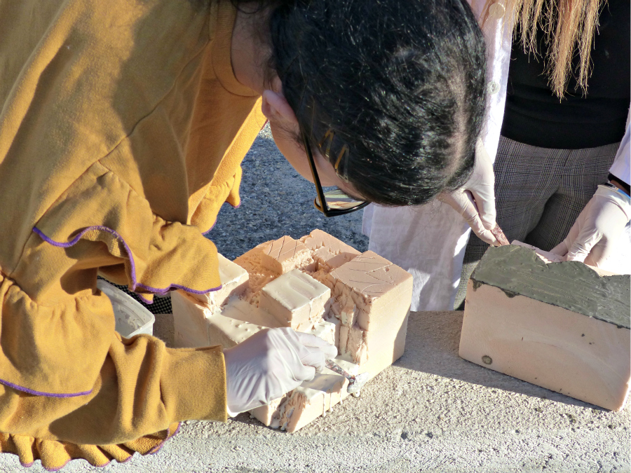 A la fin de l’atelier, les élèves recouvrent leur volume de ciment puis de sable afin de donner des effets de texture et de couleur à leur détail de ville fossilisée puis réalisent des photographies pour en garder trace