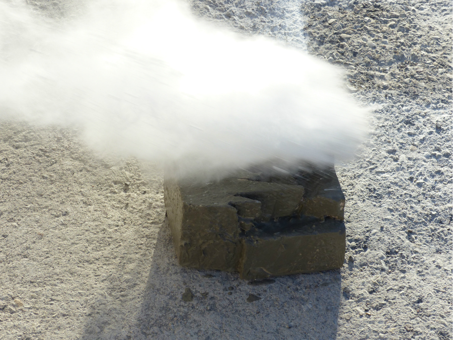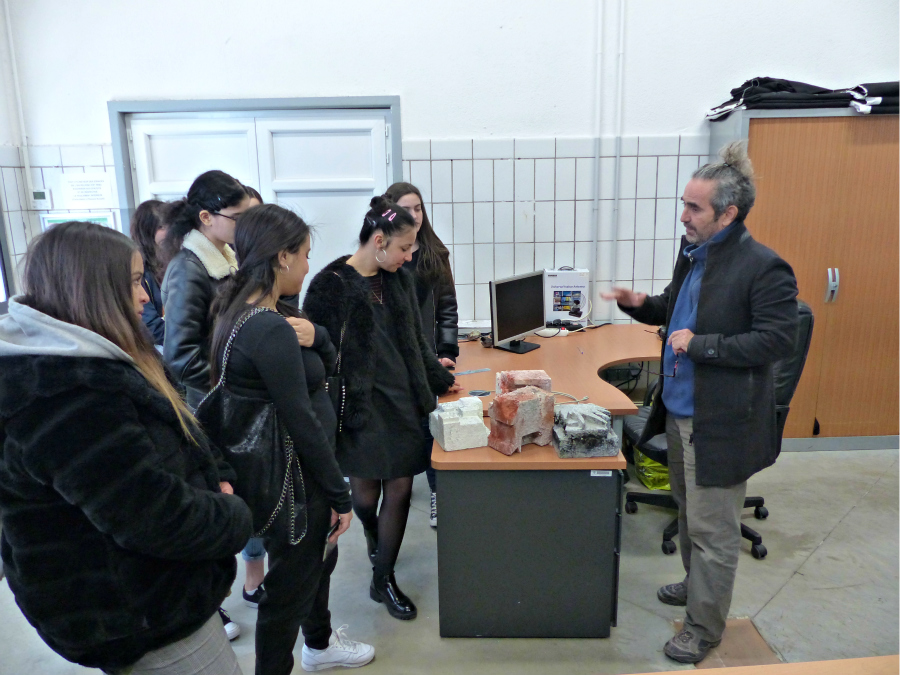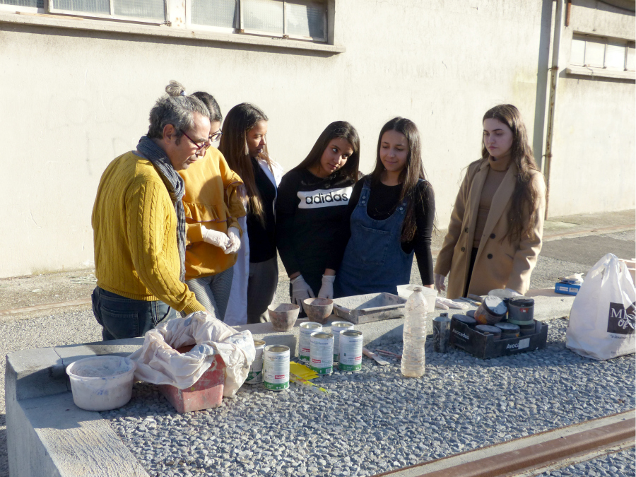 Dans un deuxième temps, Frédéric Alémany présente aux élèves les ciments blanc et gris dont ils vont, une fois mélangés à l’eau, enduire leurs volumes afin de donner une texture minérale au polystyrène.