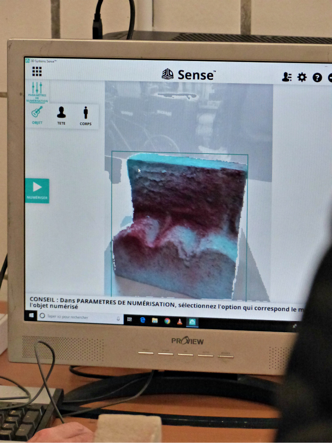 Frédéric Alémany montre aux élèves les scans réalisés avant leur venue, à partir des sculptures en polystyrène de la semaine précédente.