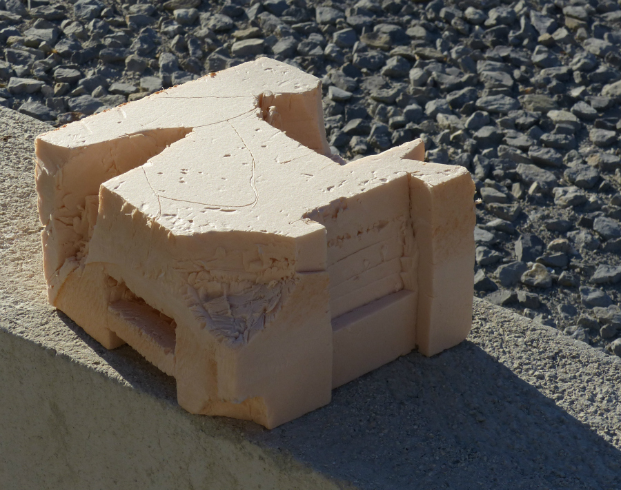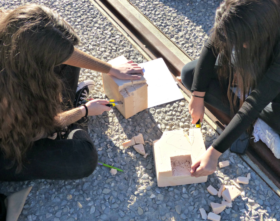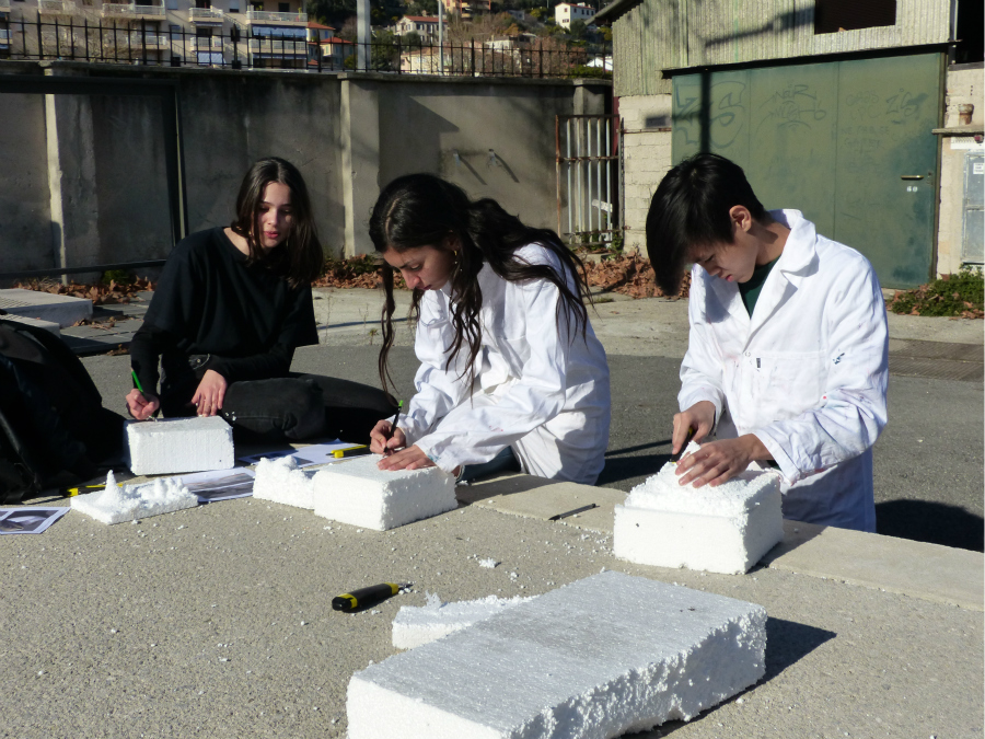 Le groupe sculpture part avec Frédéric Alémany pour travailler en plein air. Après une présentation des techniques de travail et des règles de sécurité, le groupe est amené à tailler au cutter un bloc de polystyrène tendre, dans le but de traduire en volume une interprétation du paysage numérique qu’ils ont créé précédemment.