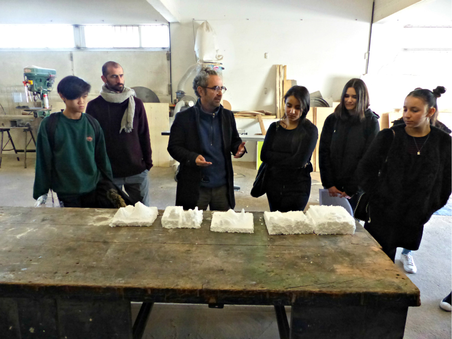 Après un temps de réflexion sur un projet de « Ville imaginaire en ruines » (réponses à un questionnaire et réalisation de croquis), le deuxième groupe découvre avec Frédéric Alemany la technique de taille du polystyrène (cube) et crée en 2 heures son paysage urbain.
