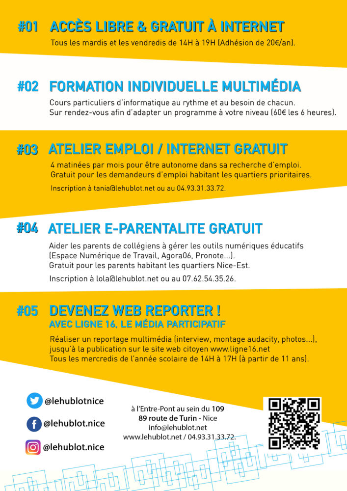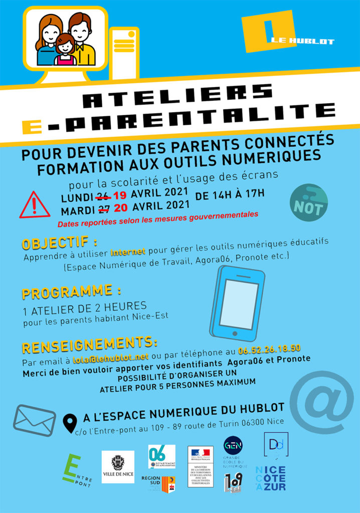 Le Hublot propose des ateliers e-parentalité afin d’aider les parents de collégiens à gérer les outils numériques éducatifs (Espace Numérique de Travail, Agora06, Pronote, etc.). Ces ateliers (3H) sont gratuits pour les habitants des quartiers Nice-Est. Ils se déroulent à l’espace numérique du Hublot (implanté au 109), 89 route de Turin, à Nice. Les prochains […]
